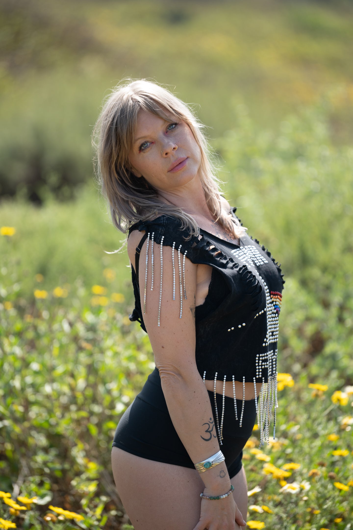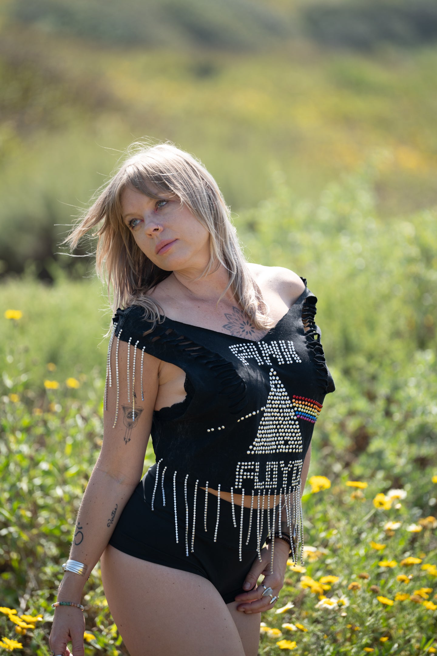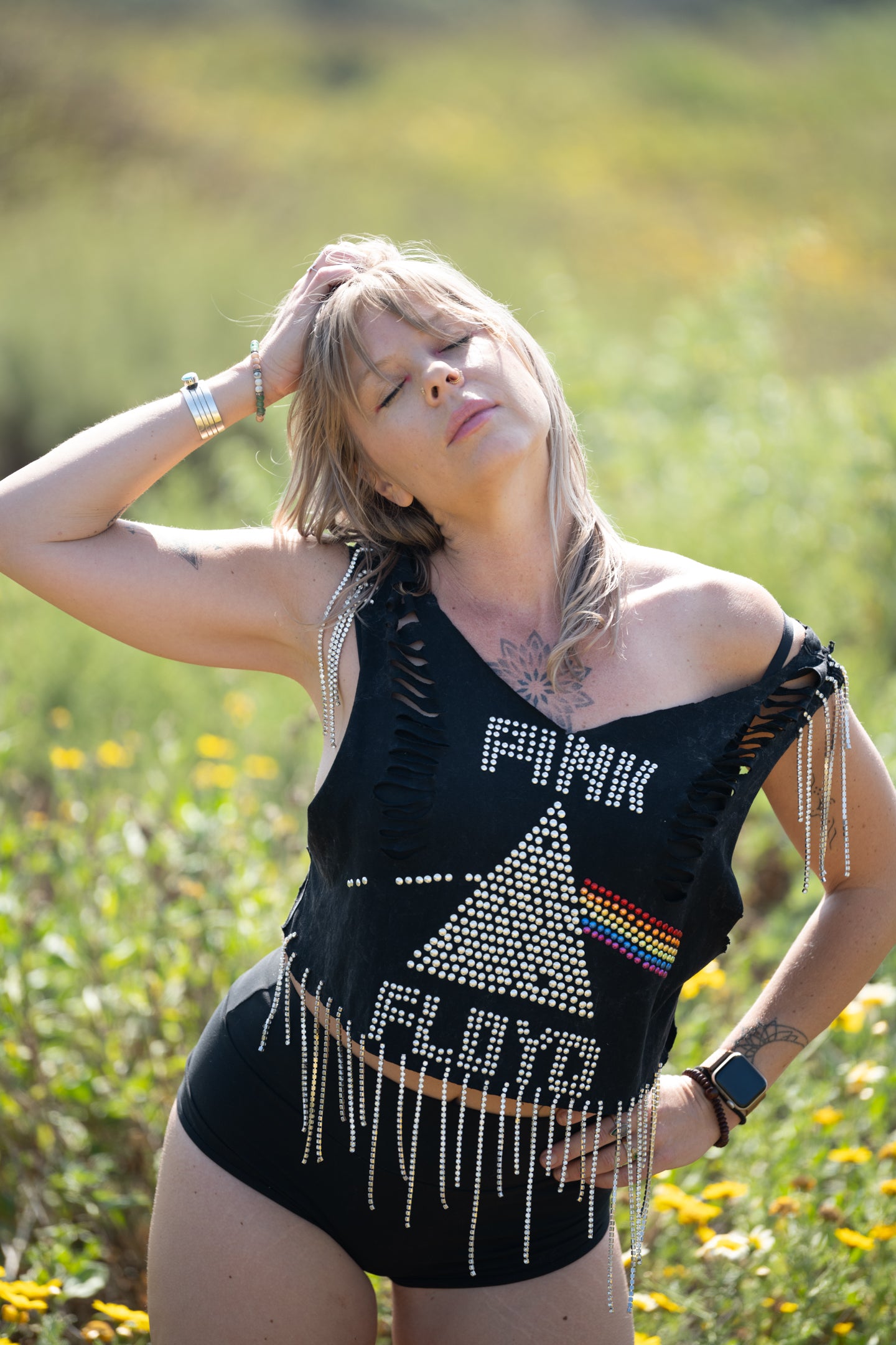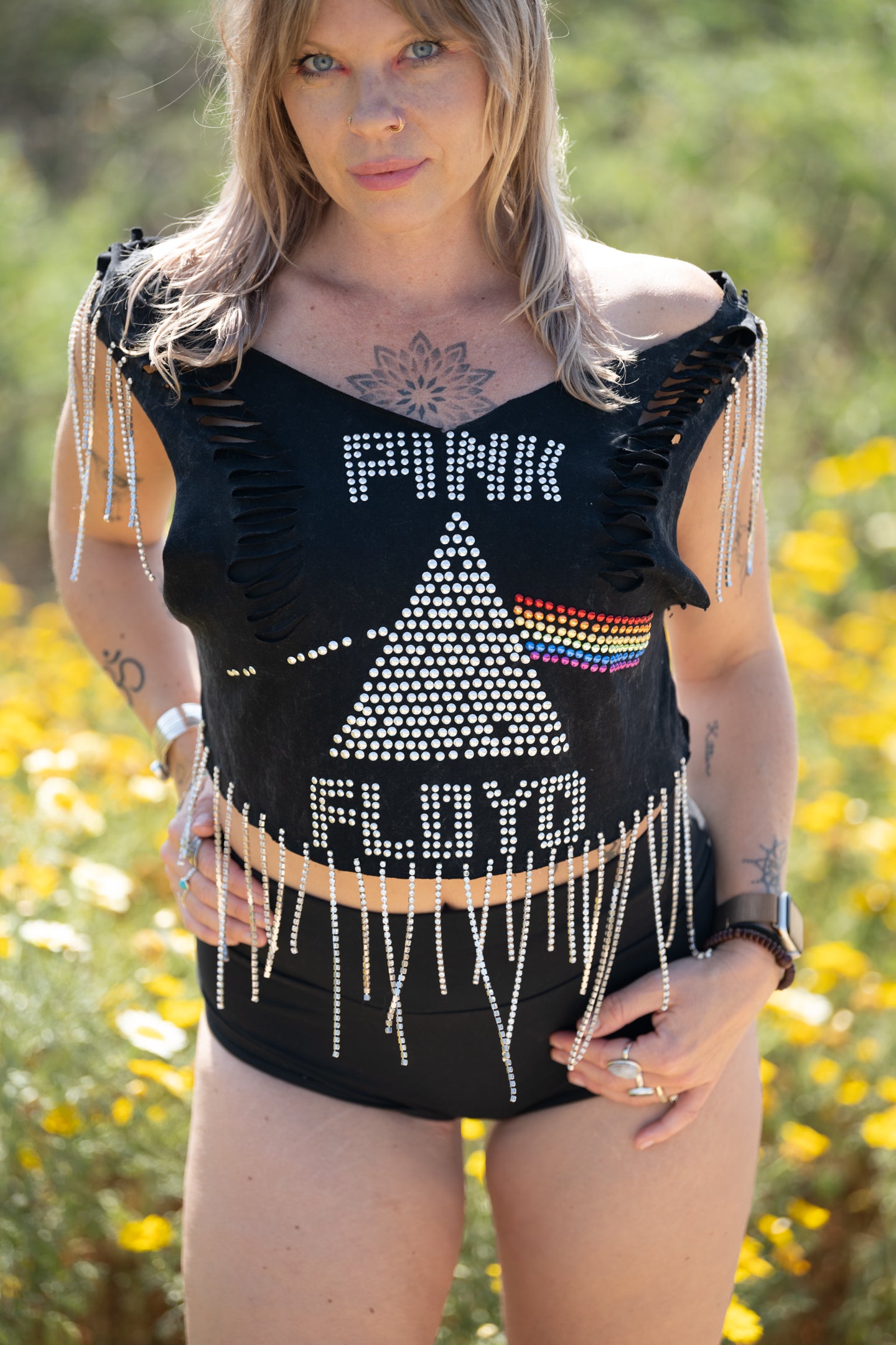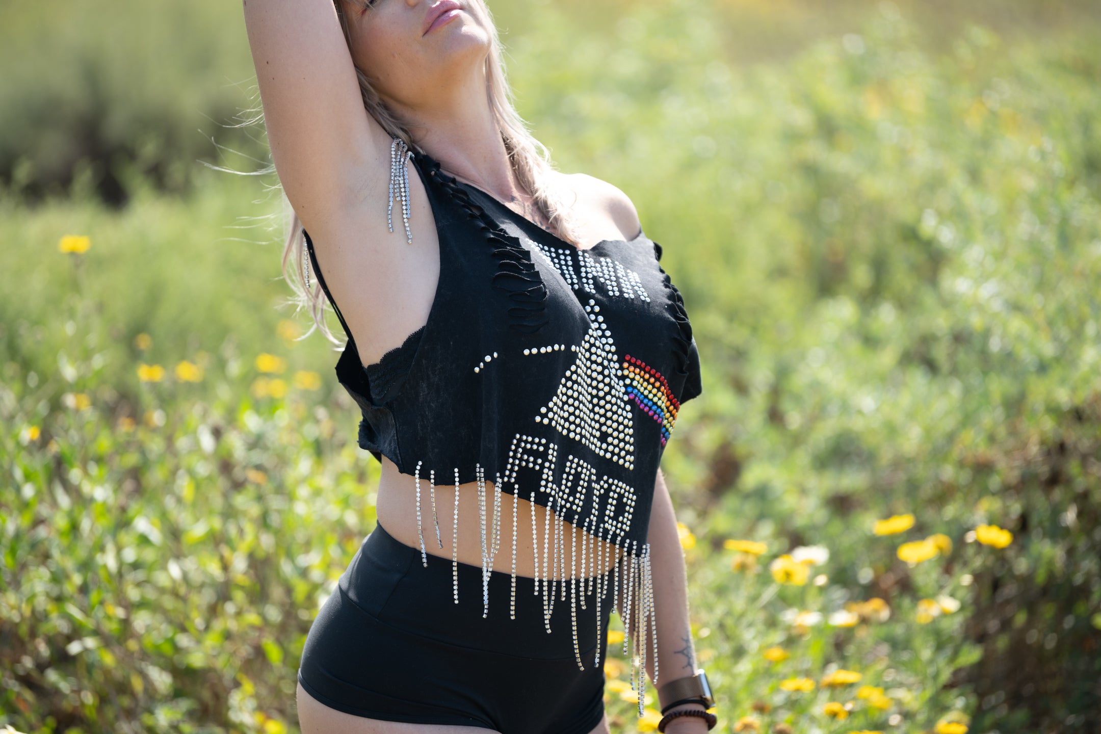 We are dripping with excitement to bring this one of a kind gem of a top! We hand sewed rhinestone strands along the bottom and on each sleeve, did braided weaves down each side on the back, and cut slits along each side on the front. She’s dazzling and will have you feeling like the rockstar you are. Top is one size, model wearing it is a size M.