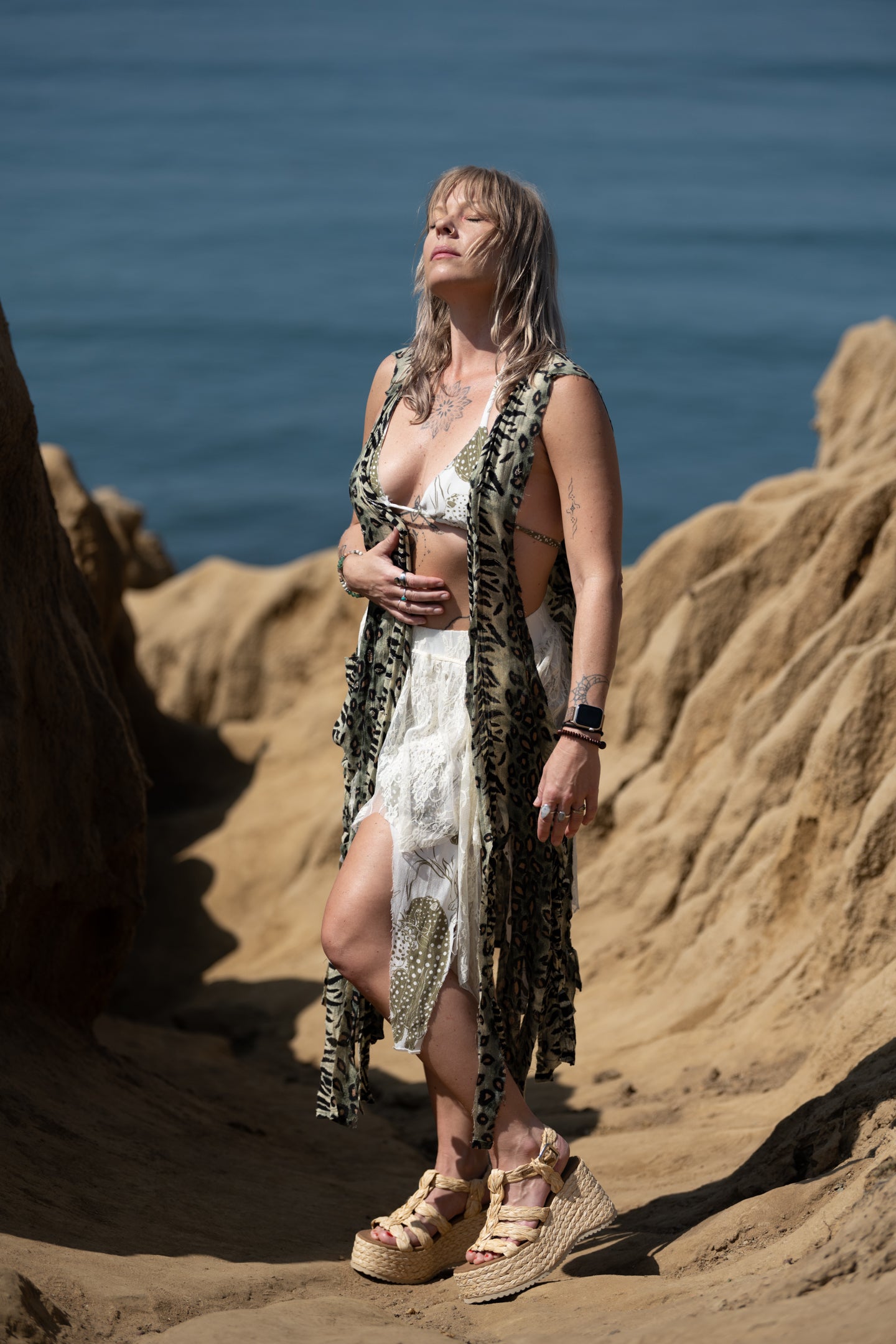We had so much fun making this set from an old dress and old kimono. We cut the dress up to make a cute set with a bikini top and skirt, and cut the kimono into a vest with braided strands, and sewed appliqué onto the back. This one of a kind set with have you feeling sexy yet free. Set is size medium, vest is one size.