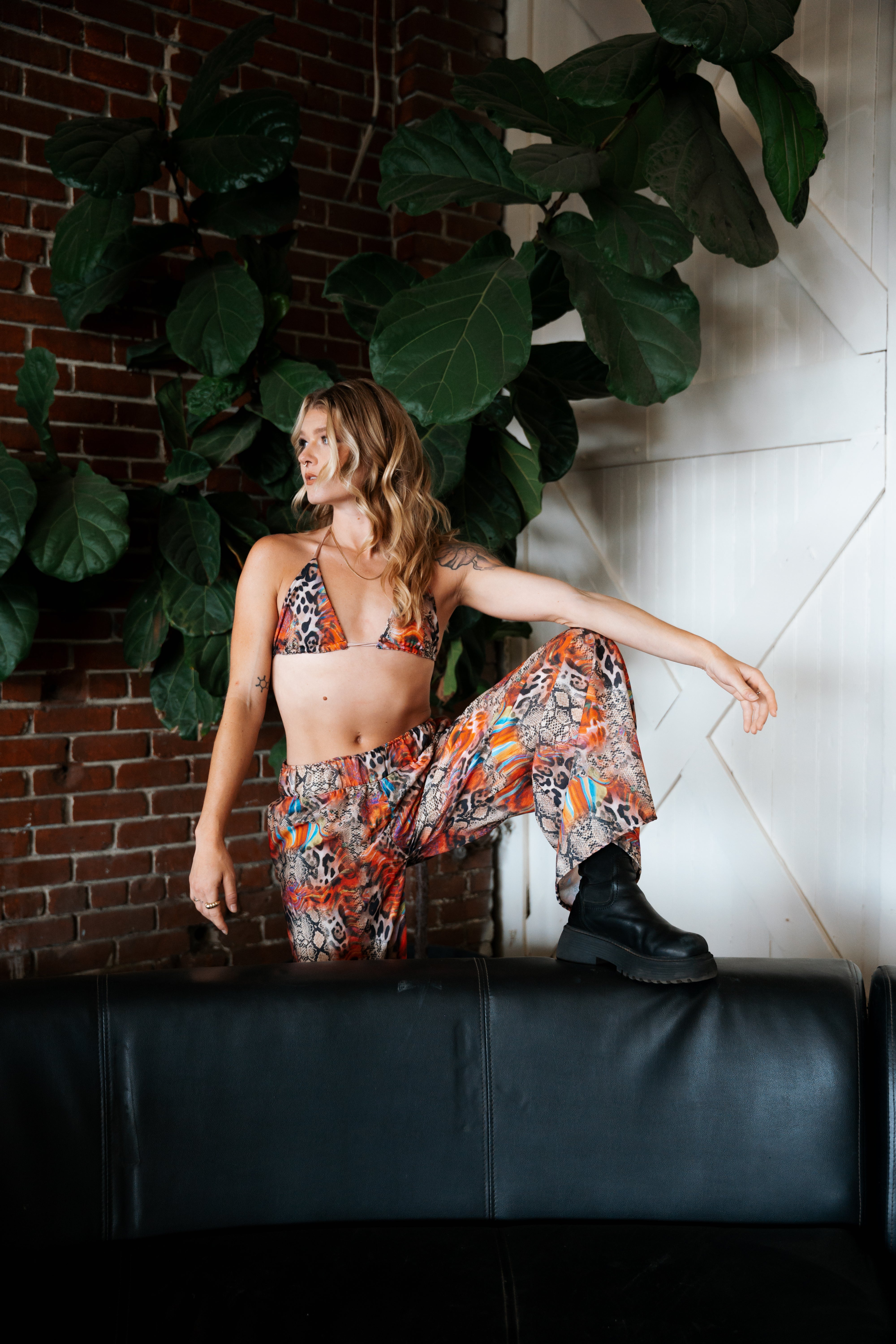 This beautiful rainbow cheetah print fabric is 100% linen, all natural fibers, and carries 4,000 htz frequency to raise your vibration while wearing. Our ultra wide linen pants have an elastic waistband and is the perfect lightweight fabric for hot days. Only 2 pairs made Size S/M.