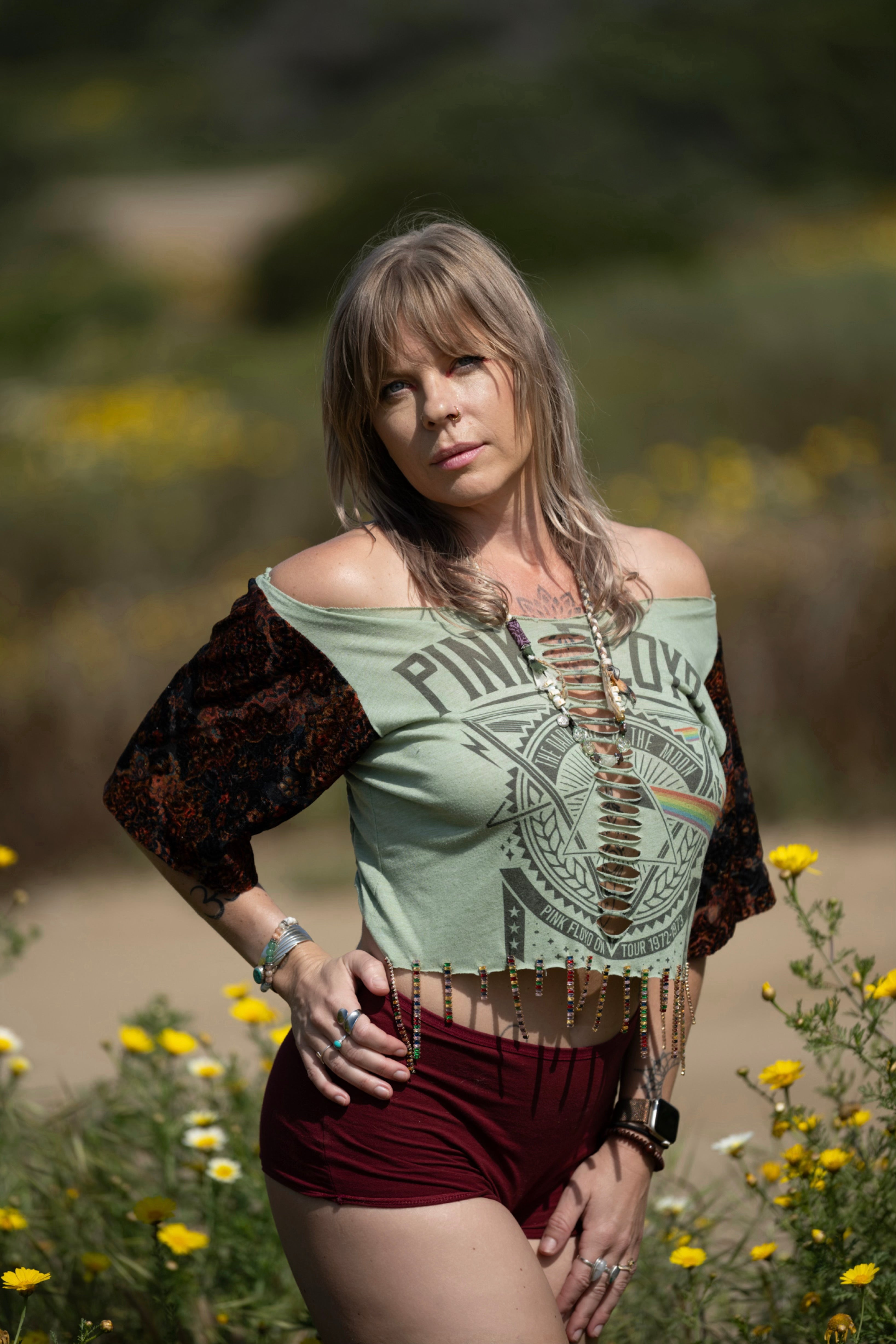 We took this Pink Floyd band tee and added sleeves from an old kimono, and rainbow crystal strands sewn along the bottom. We added braided weaves on the backside and cut slits down the front center. Top is a size M, and super comfy.