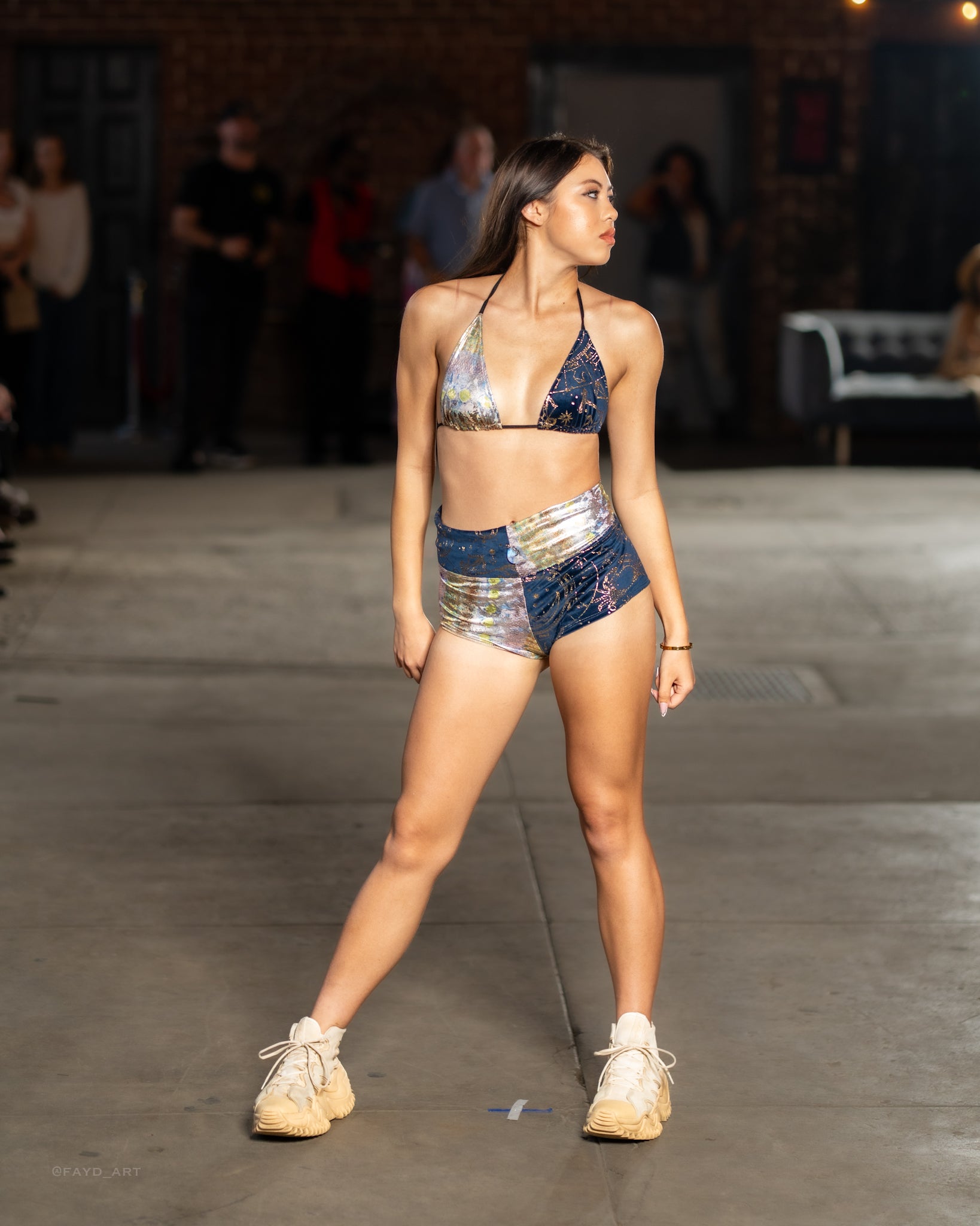 This handmade upcycled triangle top is reversible giving you comfy versatility, with funky celestial prints. Recycled poly was used for the string and it is a size S/M but will fit a Large if you like less coverage. Makes a set with our celestial scrunch shorts that has an activated black moonstone. Gentle cycle for care.